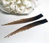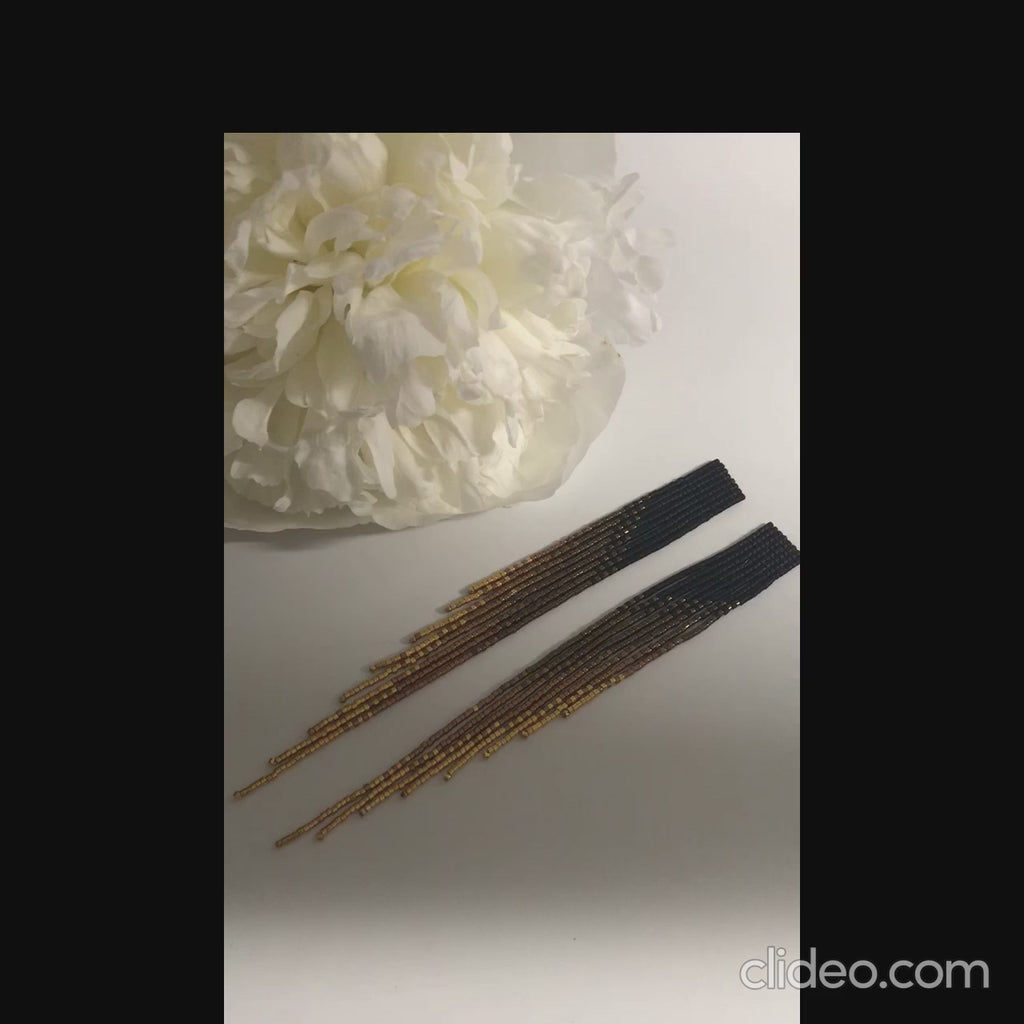 Make a bold yet elegant statement with these handcrafted beaded fringe earrings. Featuring cascading strands of tiny glass seed beads in a stunning ombre blend from deep black to radiant gold, these earrings are designed to sway gracefully with every step.